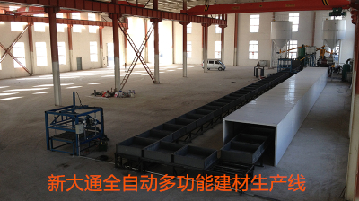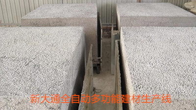 生產該種產品,工藝流程不同的地方就是在生產泡沫混凝土砌塊的基礎上,增加下料分流裝置,將料漿分別流入苯板與苯板之間的縫隙;增加一個固定苯板的裝置,當發泡料將灌注到模具里面發滿之后,就要將固定苯板的裝置提出模具;該種生產工藝既可以采用化學發泡的方法,也可以采用物理發泡的方式。
