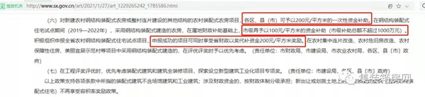 (六)對(duì)新建農(nóng)村鋼結(jié)構(gòu)裝配式農(nóng)房或整村連片建設(shè)的其他結(jié)構(gòu)的農(nóng)村裝配式農(nóng)房項(xiàng)目,各區(qū)、縣(市)可予以200元/平方米的一次性資金補(bǔ)助。在鋼結(jié)構(gòu)裝配式住宅試點(diǎn)期間(2019—2022年),采用鋼結(jié)構(gòu)裝配式建造的農(nóng)房,在屬地財(cái)政補(bǔ)助基礎(chǔ)上,市級(jí)再予以100元/平方米的資金補(bǔ)助(市級(jí)補(bǔ)助總額不超過1000萬元)。積極組織申報(bào)全省農(nóng)村鋼結(jié)構(gòu)裝配式住宅試點(diǎn)項(xiàng)目,申報(bào)成功的項(xiàng)目可同時(shí)享受省財(cái)政以獎(jiǎng)代補(bǔ)資金200元/平方米獎(jiǎng)勵(lì)。在農(nóng)村集中連片改造、農(nóng)村危舊房改造、農(nóng)村保障性住房、美麗宜居示范村等項(xiàng)目中采用鋼結(jié)構(gòu)裝配式建造的,在評(píng)優(yōu)評(píng)獎(jiǎng)時(shí)予以優(yōu)先考慮。(責(zé)任單位:市財(cái)政局、市建設(shè)局、市農(nóng)業(yè)農(nóng)村局,各區(qū)、縣〔市〕政府)